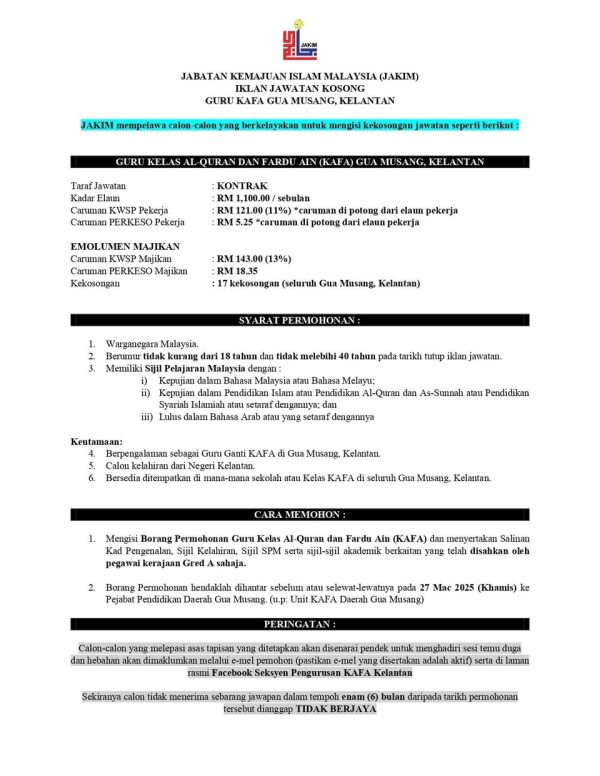 Iklan Kini Jawatan Kosong Seksyen Pengurusan KAFA Kelantan Like serta Ikut Facebook Kami, follow Chanel WhatsApp Jawatan Kosong & Telegram Portal SPA9 untuk capaian pantas kekosongan jawatan daripada kami sekarang. Klik Jawatan Disini