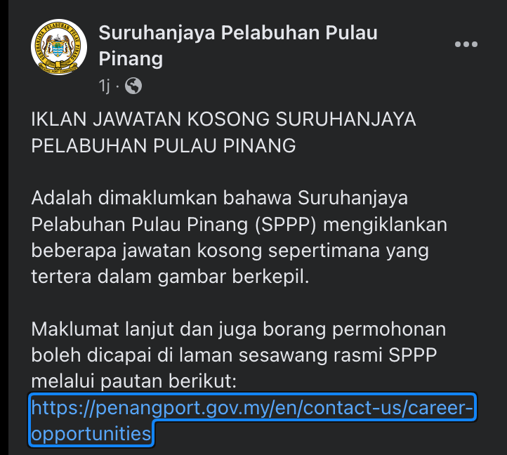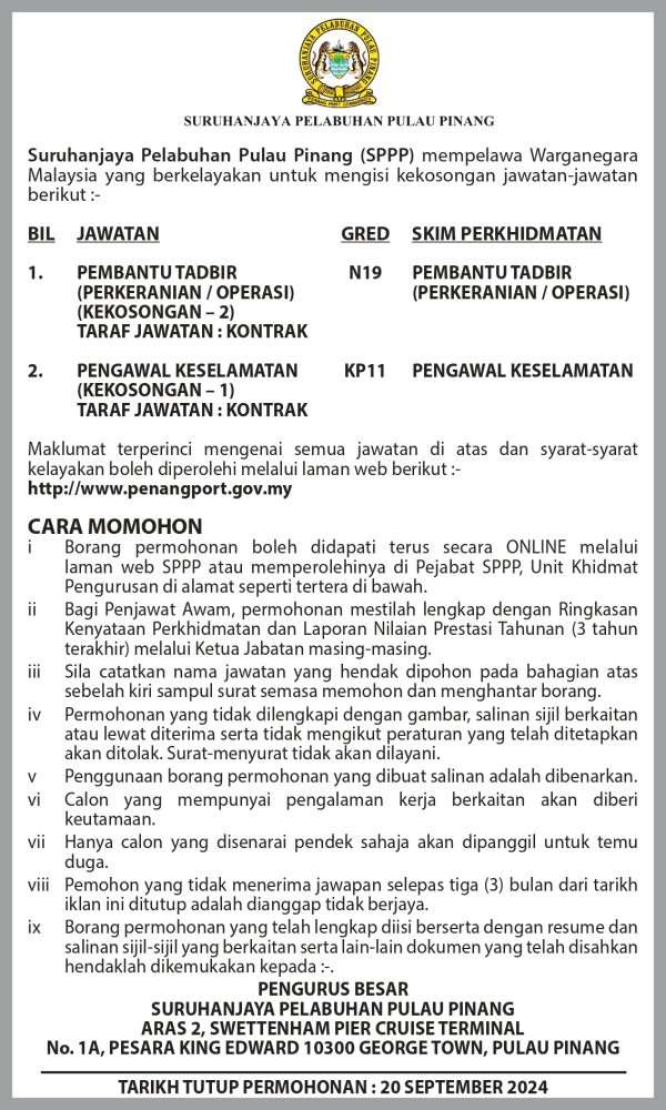 Iklan Kini Jawatan Kosong Suruhanjaya Pelabuhan Pulau Pinang