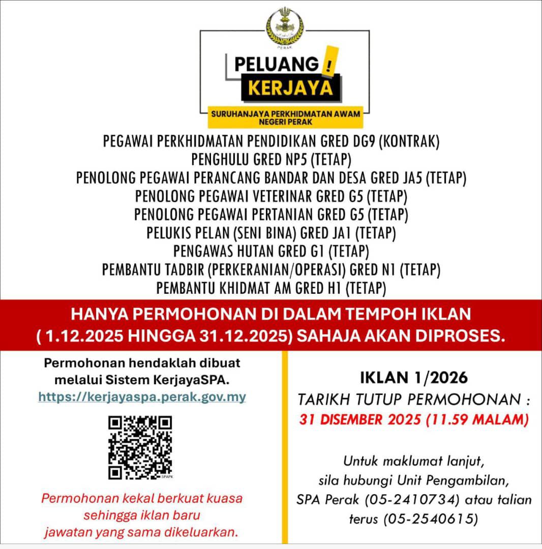Iklan Kini Jawatan Kosong Suruhanjaya Perkhidmatan Awam Negeri Perak Darul Ridzuan Like serta Ikut Facebook Kami, follow Chanel WhatsApp Jawatan Kosong & Telegram Portal SPA9 untuk capaian pantas kekosongan jawatan daripada kami sekarang. Klik Iklan Jawatan