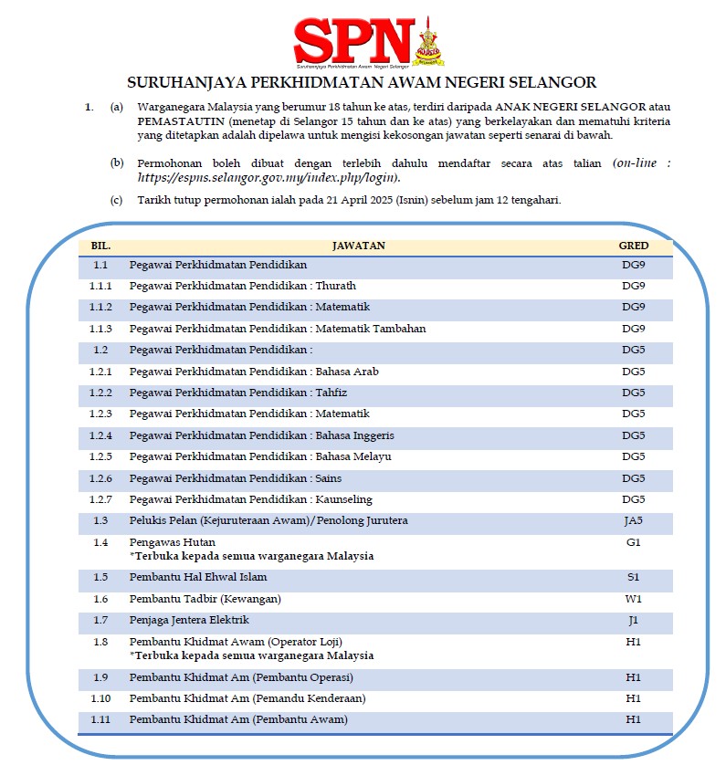 Iklan Kini Jawatan Kosong Suruhanjaya Perkhidmatan Awam Negeri Selangor Like serta Ikut Facebook Kami, follow Chanel WhatsApp Jawatan Kosong & Telegram Portal SPA9 untuk capaian pantas kekosongan jawatan daripada kami sekarang. Klik Iklan Jawatan Disini