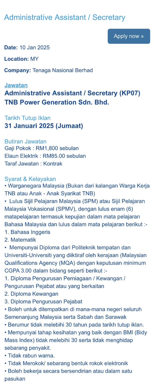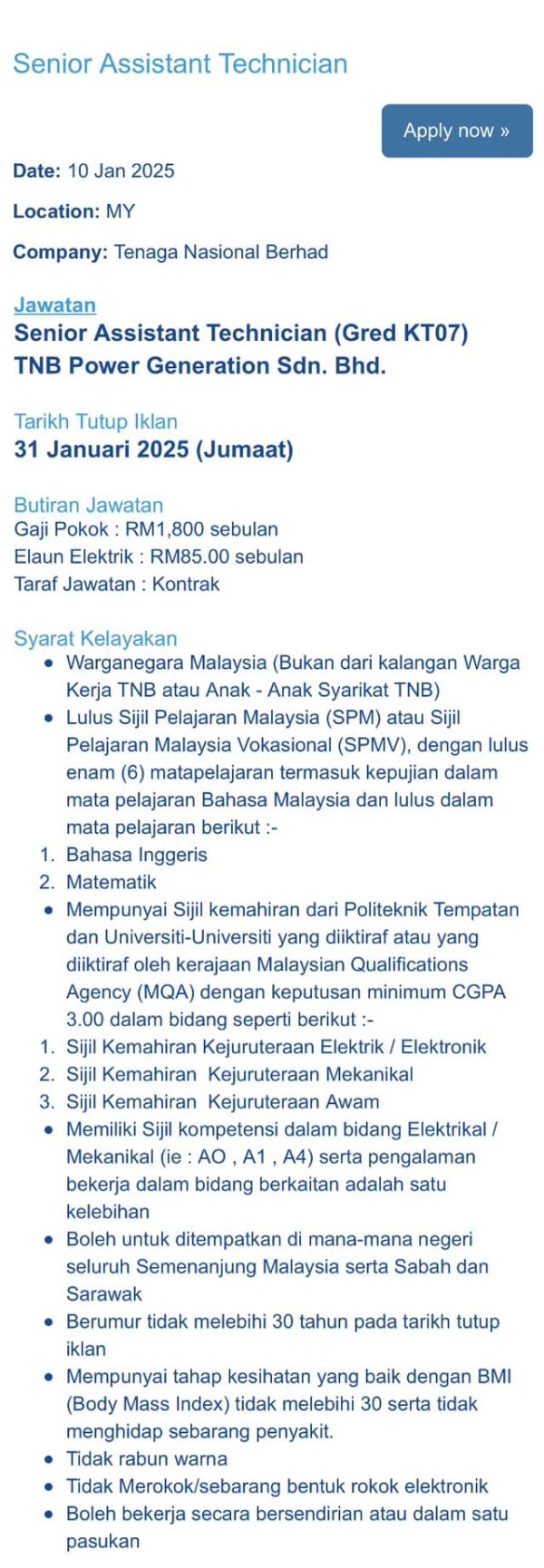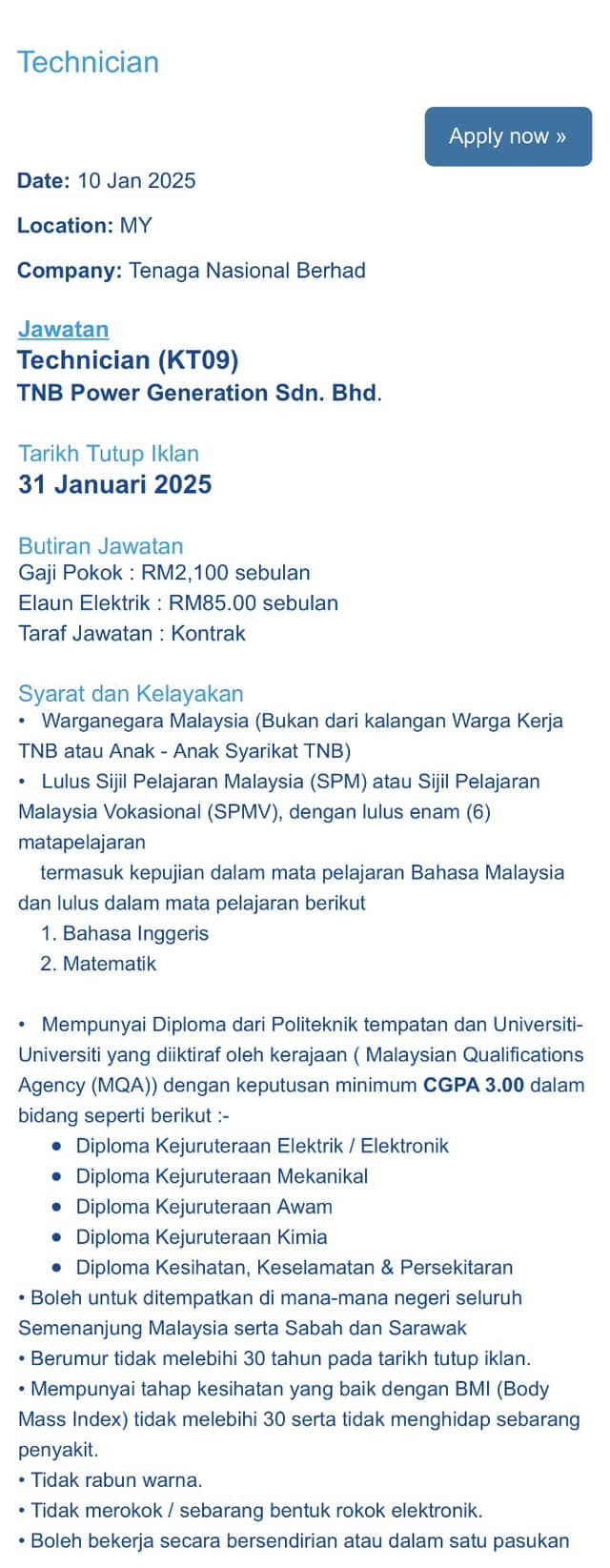 Iklan Kini Jawatan Kosong Tenaga Nasional Berhad (TNB) Like serta Ikut Facebook Kami, follow Chanel WhatsApp Jawatan Kosong & Telegram Portal SPA9 untuk capaian pantas kekosongan jawatan daripada kami sekarang. Klik Iklan Jawatan