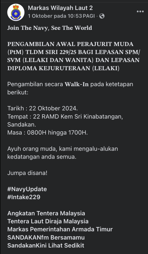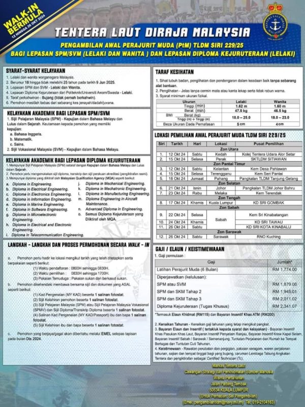 Iklan Kini Jawatan Kosong Tentera Laut Diraja Malaysia (TLDM) Like serta Ikut Facebook Kami, follow Chanel WhatsApp Jawatan Kosong & Telegram Portal SPA9 untuk capaian pantas kekosongan jawatan daripada kami sekarang.