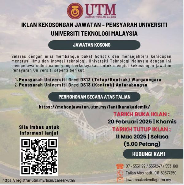 Iklan Kini Jawatan Kosong Terbaru di Universiti Teknologi Malaysia (UTM) Like serta Ikut Facebook Kami, follow Chanel WhatsApp Jawatan Kosong & Telegram Portal SPA9 untuk capaian pantas kekosongan jawatan daripada kami sekarang. Klik Jawatan Disini