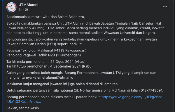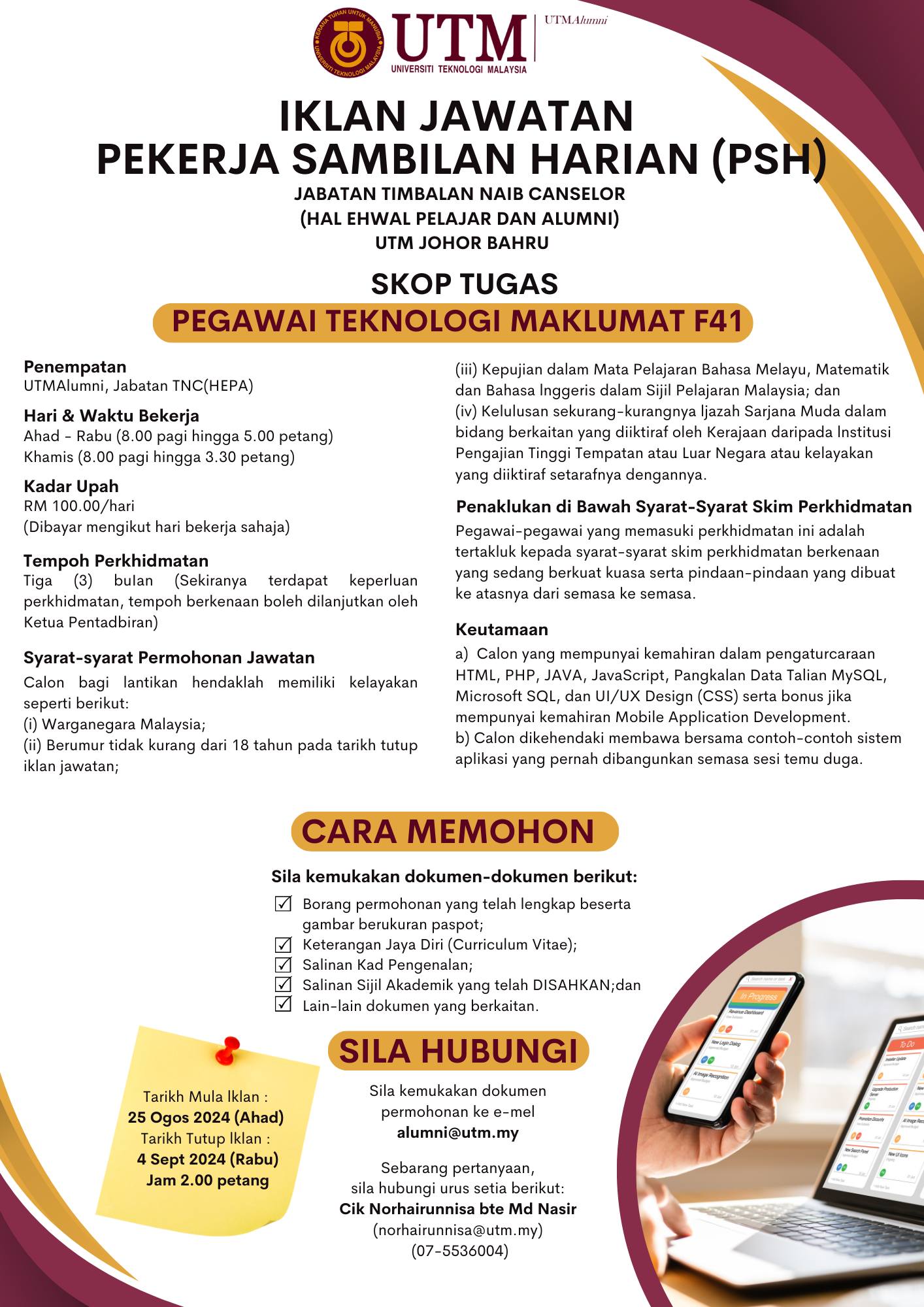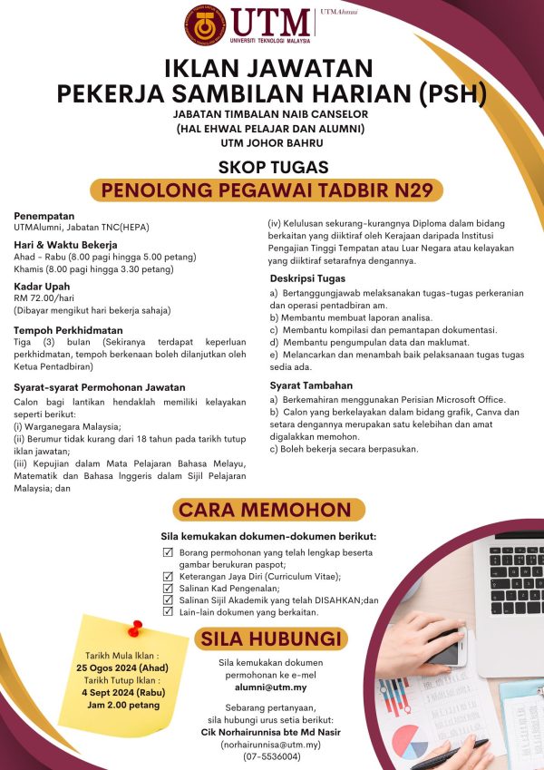 Iklan Kini Jawatan Kosong Terbaru di Universiti Teknologi Malaysia (UTM) Like serta Ikut Facebook Kami, follow Chanel WhatsApp Jawatan Kosong & Telegram Portal SPA9 untuk capaian pantas kekosongan jawatan daripada kami sekarang.
