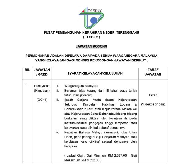Iklan Kini Jawatan Kosong Terengganu Skills Development Center (TESDEC) Like serta Ikut Facebook Kami, follow Chanel WhatsApp Jawatan Kosong & Telegram Portal SPA9 untuk capaian pantas kekosongan jawatan daripada kami sekarang. Klik Iklan Disini