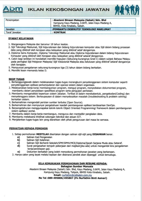 Iklan Kini Jawatan Kosong Terkini Akademi Binaan Malaysia (ABM) Like serta Ikut Facebook Kami, follow Chanel WhatsApp Jawatan Kosong & Telegram Portal SPA9 untuk capaian pantas kekosongan jawatan daripada kami sekarang. Klik Jawatan Disini