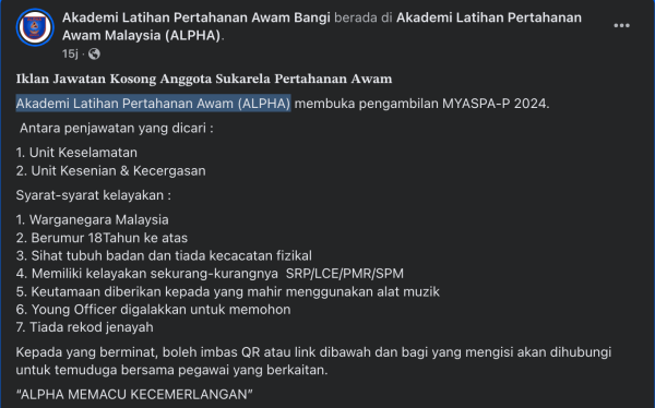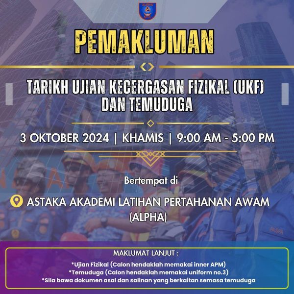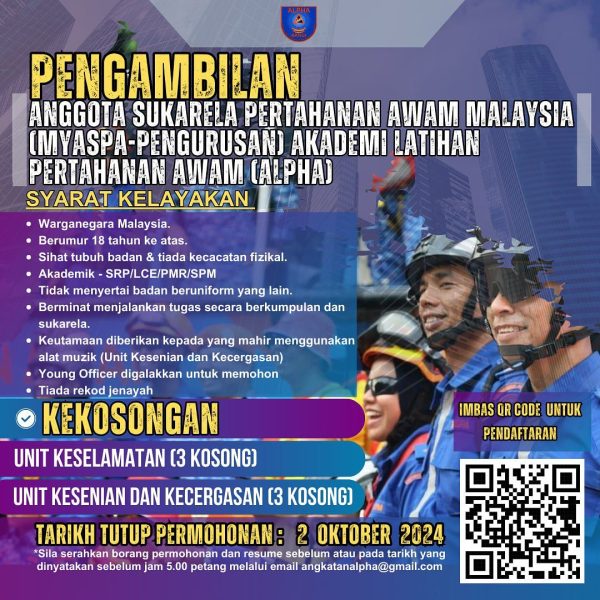 Iklan Kini Jawatan Kosong Terkini Akademi Latihan Pertahanan Awam Malaysia (ALPHA) Like serta Ikut Facebook Kami, follow Chanel WhatsApp Jawatan Kosong & Telegram Portal SPA9 untuk capaian pantas kekosongan jawatan daripada kami sekarang. Klik Jawatan Disini