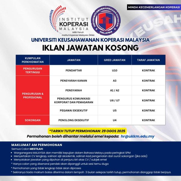 Iklan Kini Jawatan Kosong Terkini di Universiti Keusahawanan Koperasi Malaysia (UKKM) Like serta Ikut Facebook Kami, follow Chanel WhatsApp Jawatan Kosong & Telegram Portal SPA9 untuk capaian pantas kekosongan jawatan daripada kami sekarang. Klik Jawatan Disini