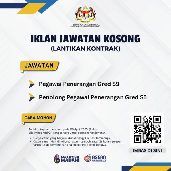 Iklan Kini Jawatan Kosong Terkini Kementerian Komunikasi Like serta Ikut Facebook Kami, follow Chanel WhatsApp Jawatan Kosong & Telegram Portal SPA9 untuk capaian pantas kekosongan jawatan daripada kami sekarang. Klik Jawatan Disini