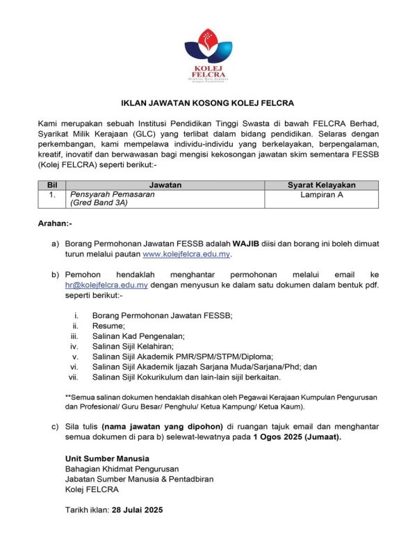 Iklan Kini Jawatan Kosong Terkini Kolej FELCRA Klik Jawatan Disini Like serta Ikut Facebook Kami, follow Chanel WhatsApp Jawatan Kosong & Telegram Portal SPA9 untuk capaian pantas kekosongan jawatan daripada kami sekarang.