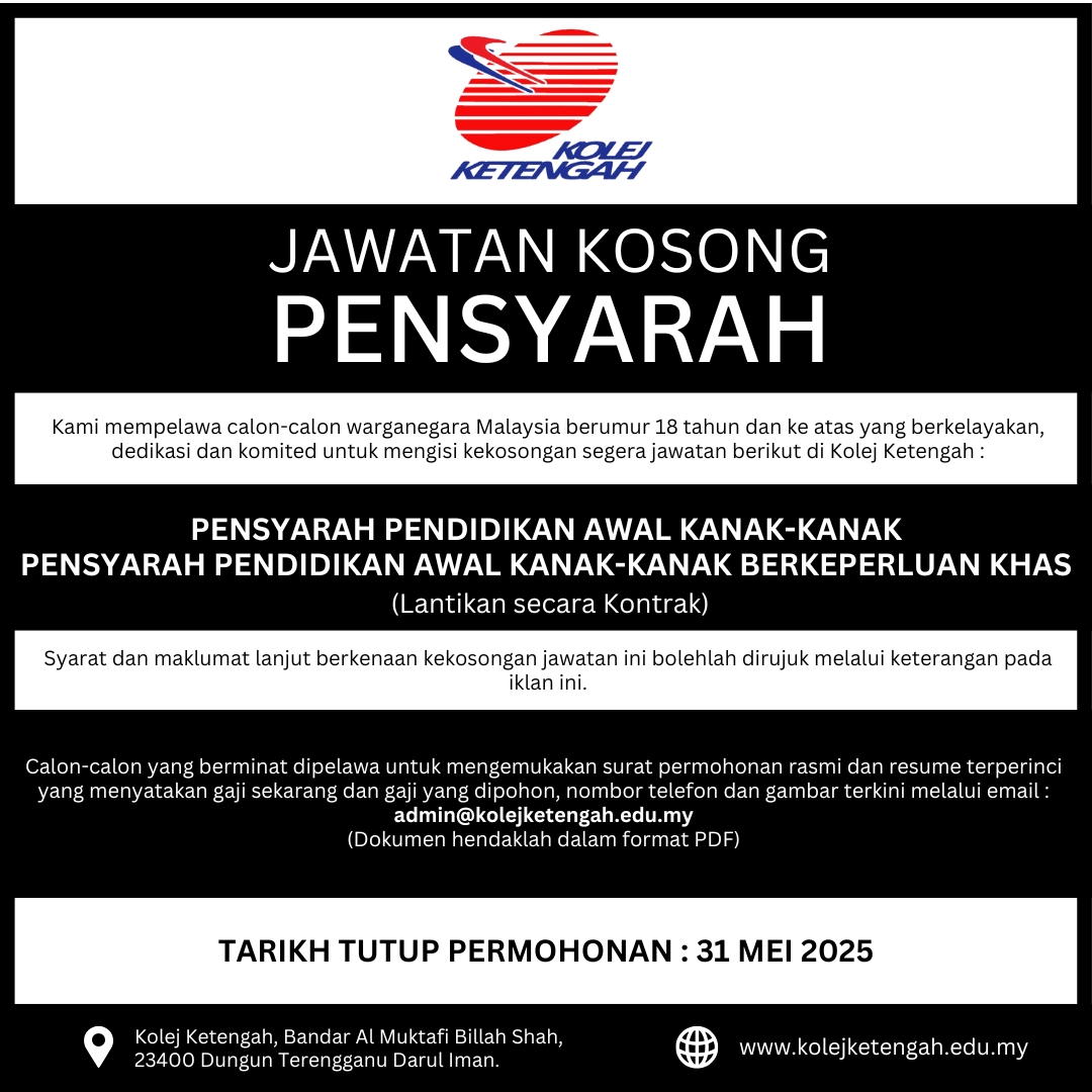 Iklan Kini Jawatan Kosong Terkini Kolej KETENGAH Klik Jawatan Disini Like serta Ikut Facebook Kami, follow Chanel WhatsApp Jawatan Kosong & Telegram Portal SPA9 untuk capaian pantas kekosongan jawatan daripada kami sekarang.