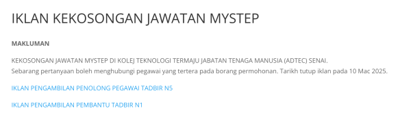 Iklan Kini Jawatan Kosong Terkini Kolej Teknologi Termaju Jabatan Tenaga Manusia (ADTEC) Like serta Ikut Facebook Kami, follow Chanel WhatsApp Jawatan Kosong & Telegram Portal SPA9 untuk capaian pantas kekosongan jawatan daripada kami sekarang. Klik Jawatan Disini