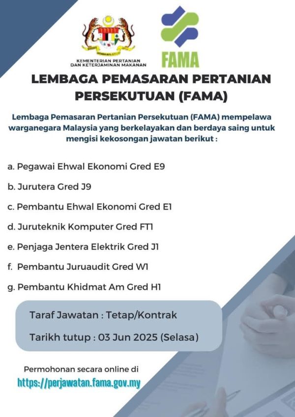 Iklan Kini Jawatan Kosong Terkini Lembaga Pemasaran Pertanian Persekutuan (FAMA) Like serta Ikut Facebook Kami, follow Chanel WhatsApp Jawatan Kosong & Telegram Portal SPA9 untuk capaian pantas kekosongan jawatan daripada kami sekarang. Klik IKlan Disini