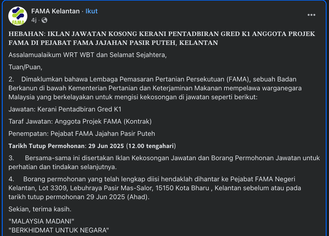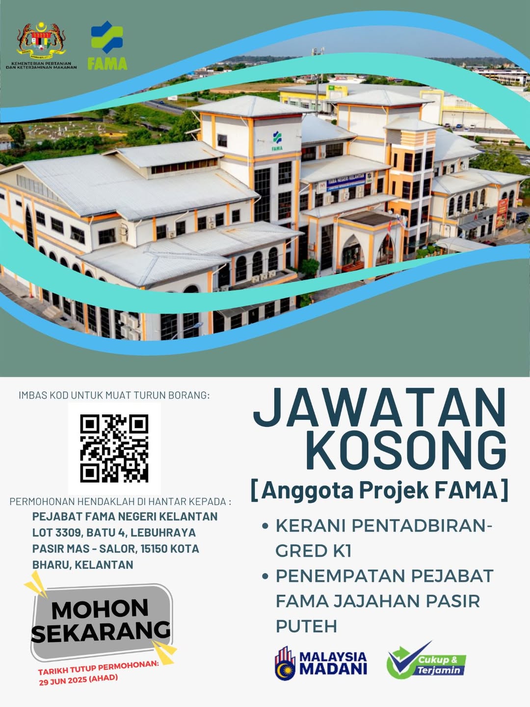 Iklan Kini Jawatan Kosong Terkini Lembaga Pemasaran Pertanian Persekutuan (FAMA) Like serta Ikut Facebook Kami, follow Chanel WhatsApp Jawatan Kosong & Telegram Portal SPA9 untuk capaian pantas kekosongan jawatan daripada kami sekarang. Klik Jawatan Disini