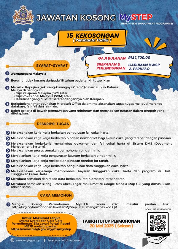 Iklan Kini Jawatan Kosong Terkini Majlis Bandaraya Johor Bahru (MBJB) Klik Jawatan Disini Like serta Ikut Facebook Kami, follow Chanel WhatsApp Jawatan Kosong & Telegram Portal SPA9 untuk capaian pantas kekosongan jawatan daripada kami sekarang.