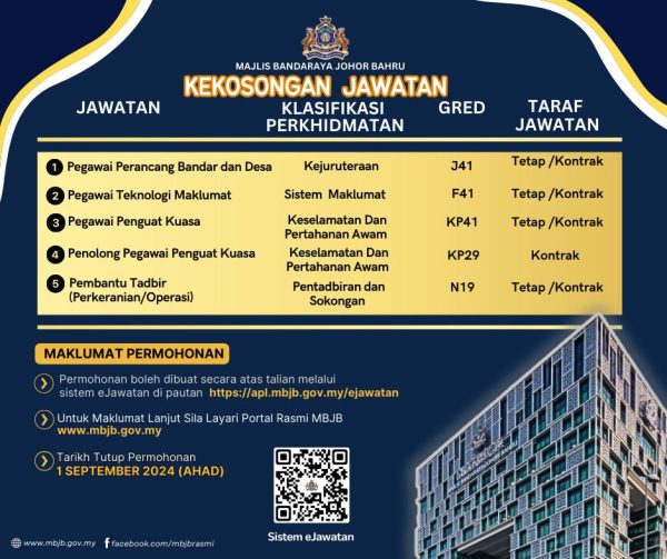 Iklan Kini Jawatan Kosong Terkini Majlis Bandaraya Johor Bahru (MBJB) Klik Jawatan Disini Like serta Ikut Facebook Kami, follow Chanel WhatsApp Jawatan Kosong & Telegram Portal SPA9 untuk capaian pantas kekosongan jawatan daripada kami sekarang.