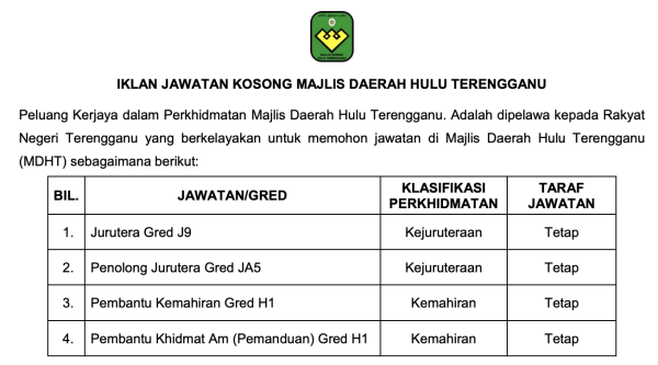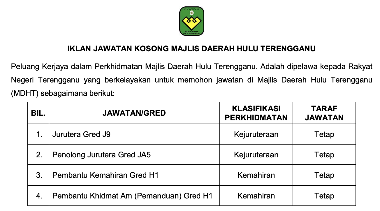 Iklan Kini Jawatan Kosong Terkini Majlis Daerah Hulu Terengganu (MDHT) Like serta Ikut Facebook Kami, follow Chanel WhatsApp Jawatan Kosong & Telegram Portal SPA9 untuk capaian pantas kekosongan jawatan daripada kami sekarang. Klik Iklan Jawatan