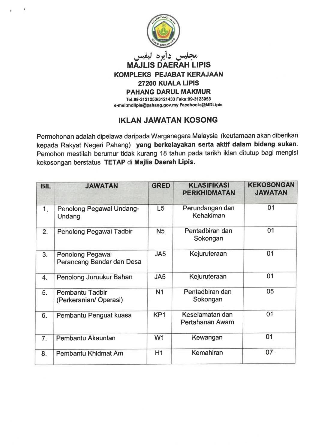Iklan Kini Jawatan Kosong Terkini Majlis Daerah Lipis Like serta Ikut Facebook Kami, follow Chanel WhatsApp Jawatan Kosong & Telegram Portal SPA9 untuk capaian pantas kekosongan jawatan daripada kami sekarang. Klik Iklan Jawatan Disini