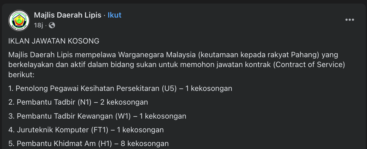 Iklan Kini Jawatan Kosong Terkini Majlis Daerah Lipis Like serta Ikut Facebook Kami, follow Chanel WhatsApp Jawatan Kosong & Telegram Portal SPA9 untuk capaian pantas kekosongan jawatan daripada kami sekarang. Klik Jawatan Disini