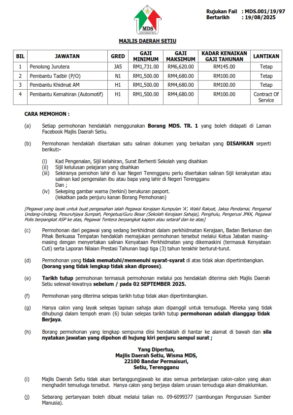 Iklan Kini Jawatan Kosong Terkini Majlis Daerah Setiu Like serta Ikut Facebook Kami, follow Chanel WhatsApp Jawatan Kosong & Telegram Portal SPA9 untuk capaian pantas kekosongan jawatan daripada kami sekarang. Klik Iklan Disini