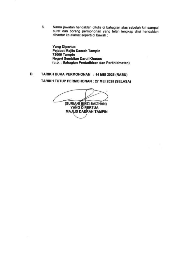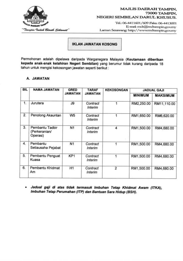 Iklan Kini Jawatan Kosong Terkini Majlis Daerah Tampin Klik Jawatan Disini Like serta Ikut Facebook Kami, follow Chanel WhatsApp Jawatan Kosong & Telegram Portal SPA9 untuk capaian pantas kekosongan jawatan daripada kami sekarang.