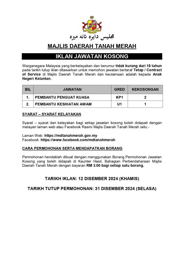 Iklan Kini Jawatan Kosong Terkini Majlis Daerah Tanah Merah (MDTM) Like serta Ikut Facebook Kami, follow Chanel WhatsApp Jawatan Kosong & Telegram Portal SPA9 untuk capaian pantas kekosongan jawatan daripada kami sekarang. Klik Iklan Jawatan