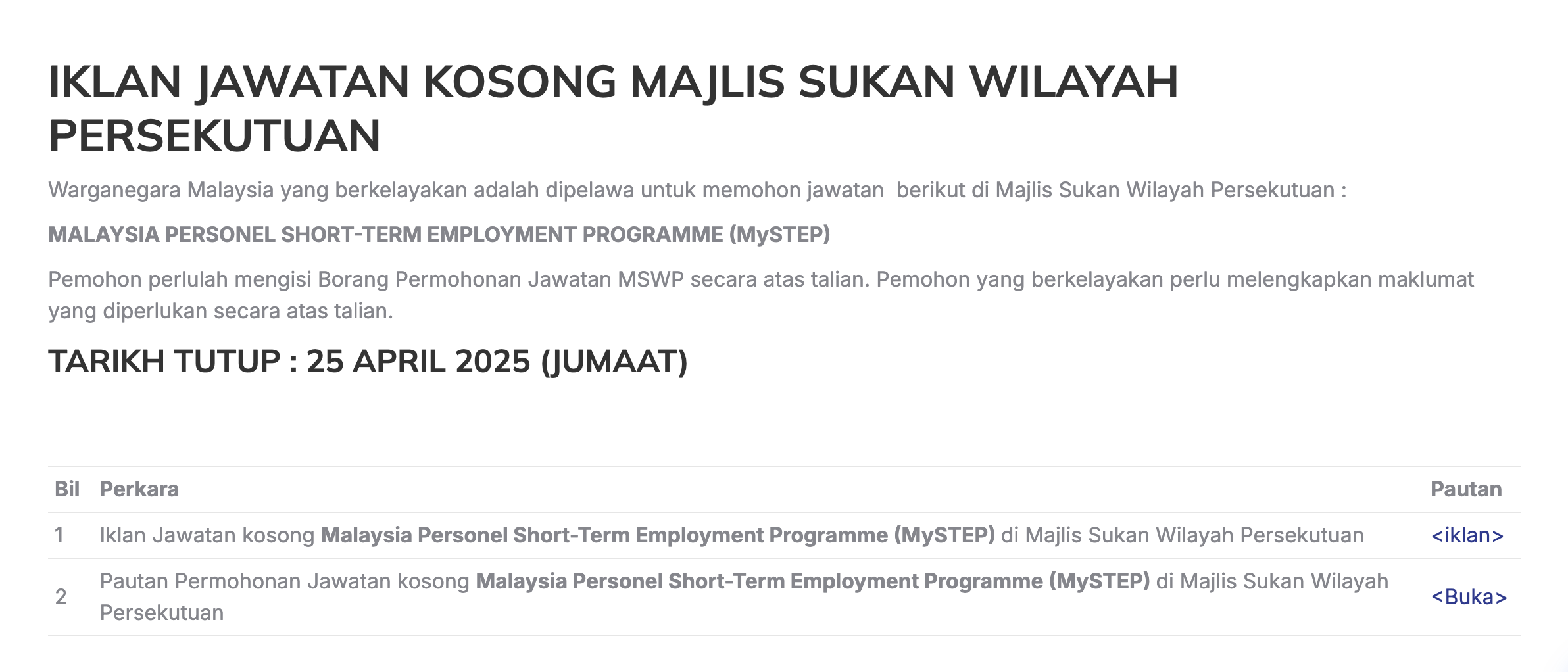 Iklan Kini Jawatan Kosong Terkini Majlis Sukan Wilayah Persekutuan (WIPERS) Klik Jawatan Disini Like serta Ikut Facebook Kami, follow Chanel WhatsApp Jawatan Kosong & Telegram Portal SPA9 untuk capaian pantas kekosongan jawatan daripada kami sekarang.