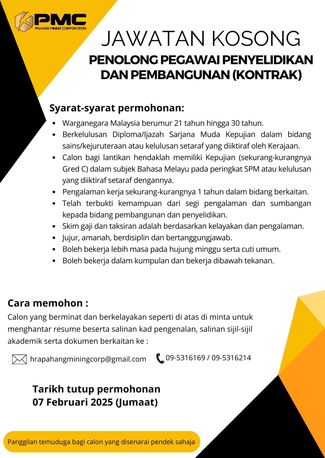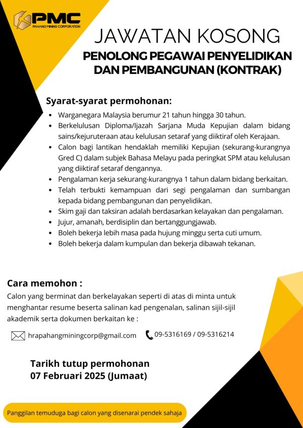 Iklan Kini Jawatan Kosong Terkini Pahang Mining Corporation (PMC) Like serta Ikut Facebook Kami, follow Chanel WhatsApp Jawatan Kosong & Telegram Portal SPA9 untuk capaian pantas kekosongan jawatan daripada kami sekarang.