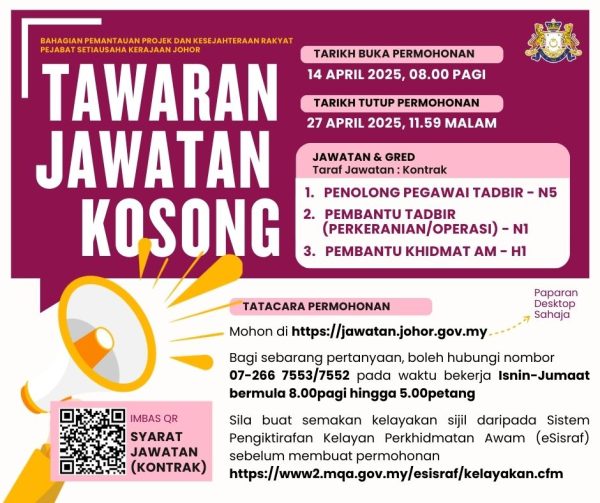 Iklan Kini Jawatan Kosong Terkini Pelbagai Jabatan Kerajaan Negeri Johor Like serta Ikut Facebook Kami, follow Chanel WhatsApp Jawatan Kosong & Telegram Portal SPA9 untuk capaian pantas kekosongan jawatan daripada kami sekarang. Klik Iklan Jawatan Disini