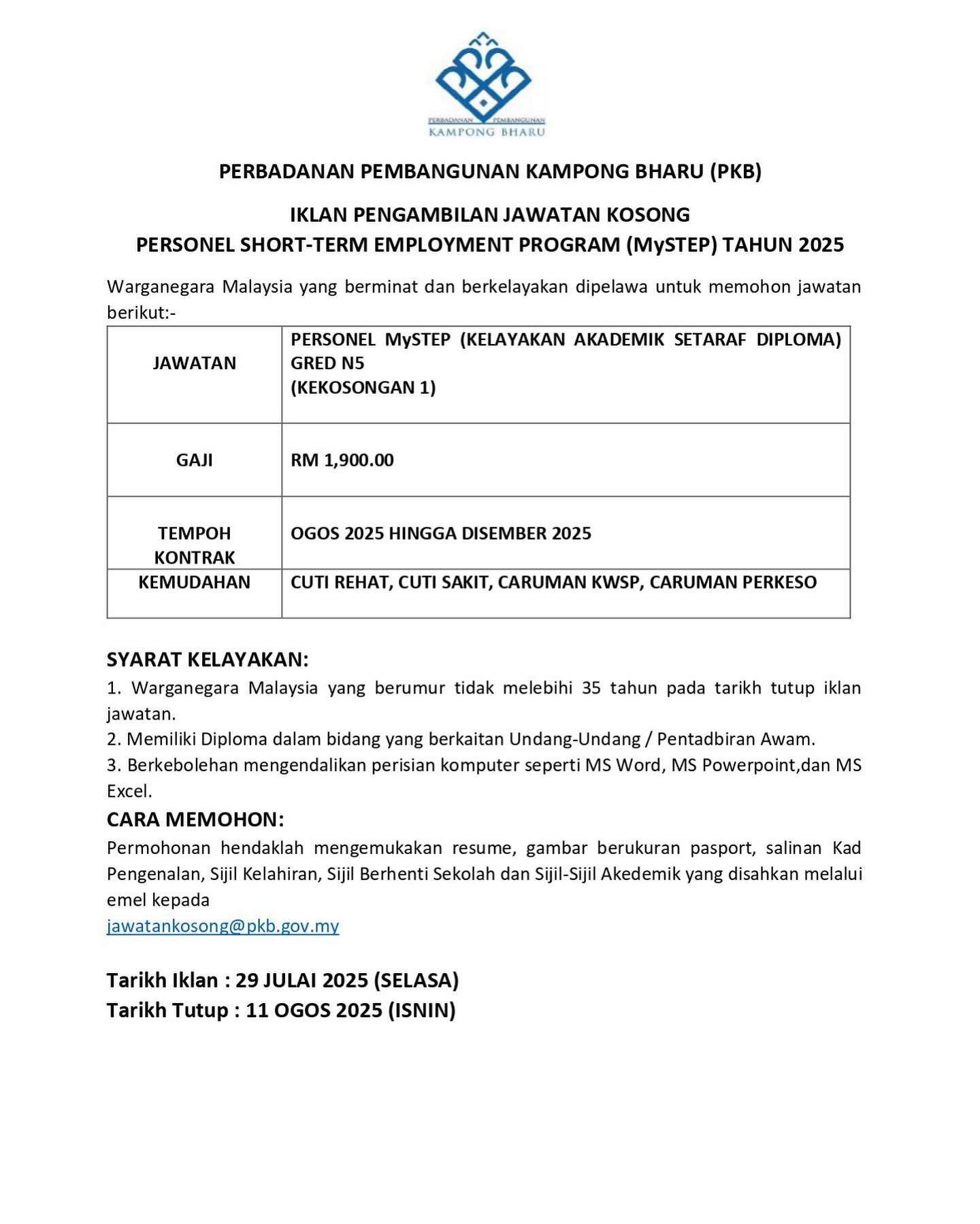Iklan Kini Jawatan Kosong Terkini Perbadanan Pembangunan Kampong Bharu (PKB) Like serta Ikut Facebook Kami, follow Chanel WhatsApp Jawatan Kosong & Telegram Portal SPA9 untuk capaian pantas kekosongan jawatan daripada kami sekarang. Klik Jawatan Disini