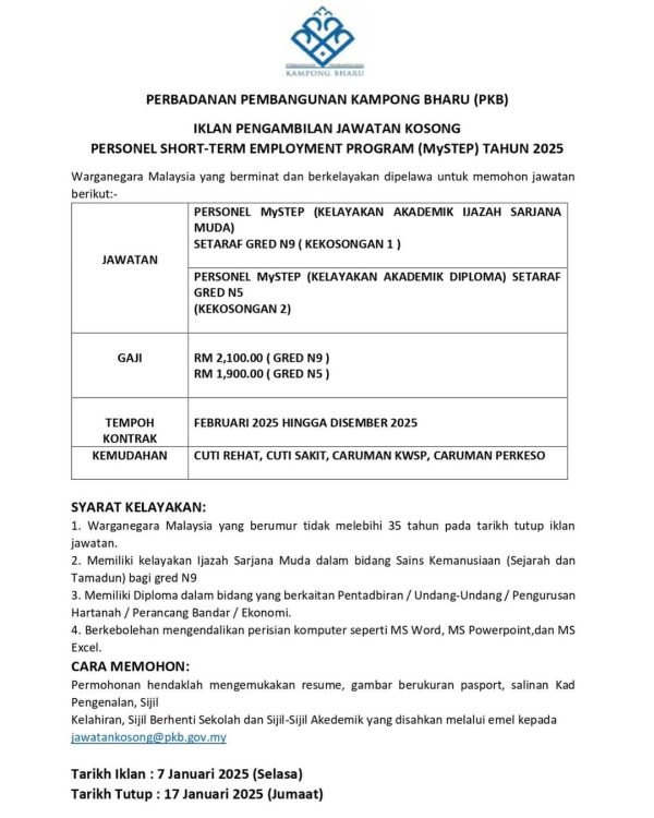 IKlan Kini Jawatan Kosong Terkini Perbadanan Pembangunan Kampong Bharu (PKB) Klik Iklan Jawatan Like serta Ikut Facebook Kami, follow Chanel WhatsApp Jawatan Kosong & Telegram Portal SPA9 untuk capaian pantas kekosongan jawatan daripada kami sekarang.