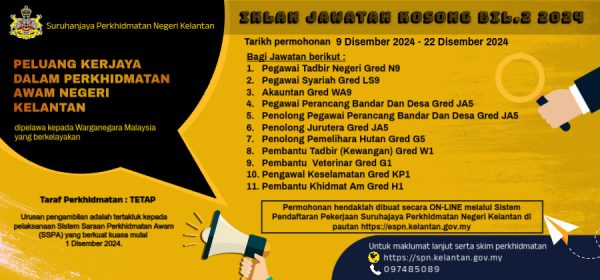 Iklan Kini Jawatan Kosong Terkini Suruhanjaya Perkhidmatan Negeri Kelantan (SPN Kelantan) Like serta Ikut Facebook Kami, follow Chanel WhatsApp Jawatan Kosong & Telegram Portal SPA9 untuk capaian pantas kekosongan jawatan daripada kami sekarang. Klik Iklan Jawatan