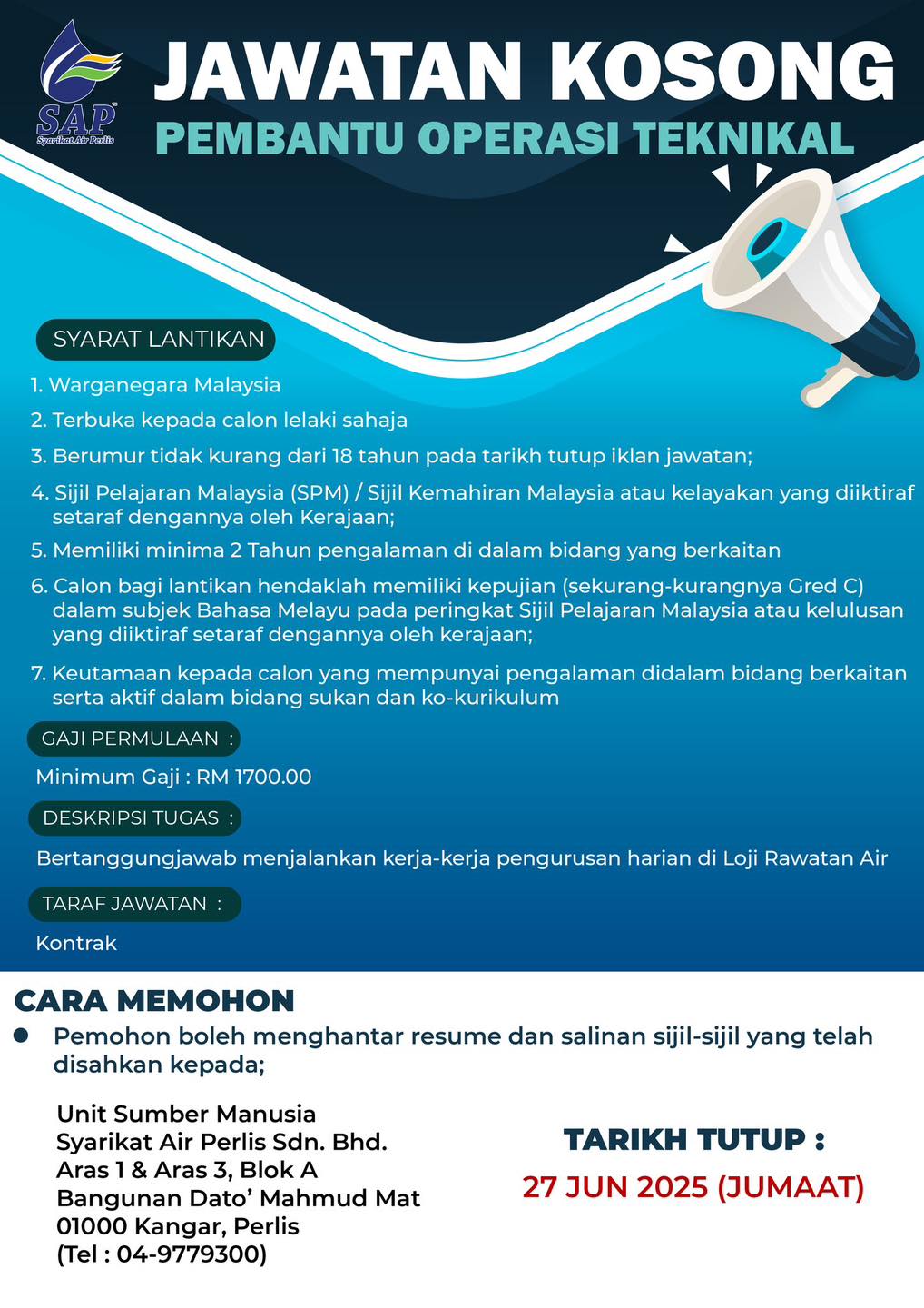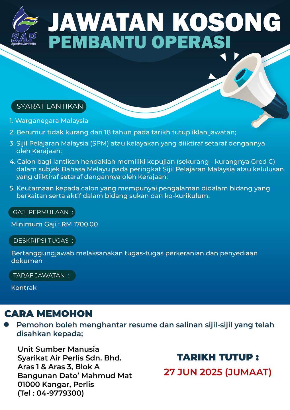 Iklan Kini Jawatan Kosong Terkini Syarikat Air Perlis (SAP) Like serta Ikut Facebook Kami, follow Chanel WhatsApp Jawatan Kosong & Telegram Portal SPA9 untuk capaian pantas kekosongan jawatan daripada kami sekarang.