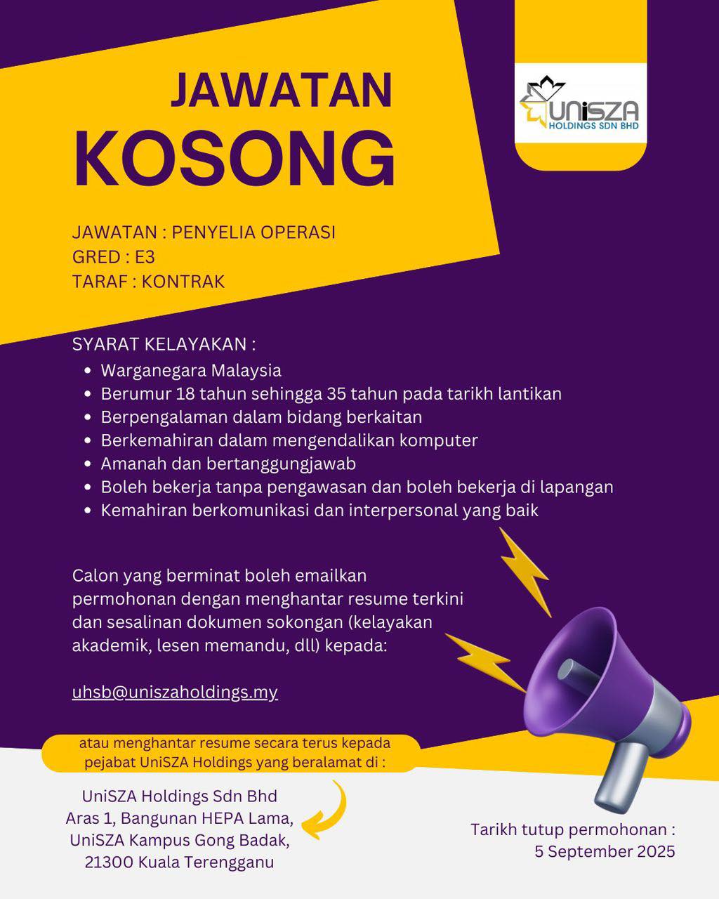 Iklan Kini Jawatan Kosong Terkini UniSZA Holdings Sdn Bhd Like serta Ikut Facebook Kami, follow Chanel WhatsApp Jawatan Kosong & Telegram Portal SPA9 untuk capaian pantas kekosongan jawatan daripada kami sekarang. Klik Iklan Disini