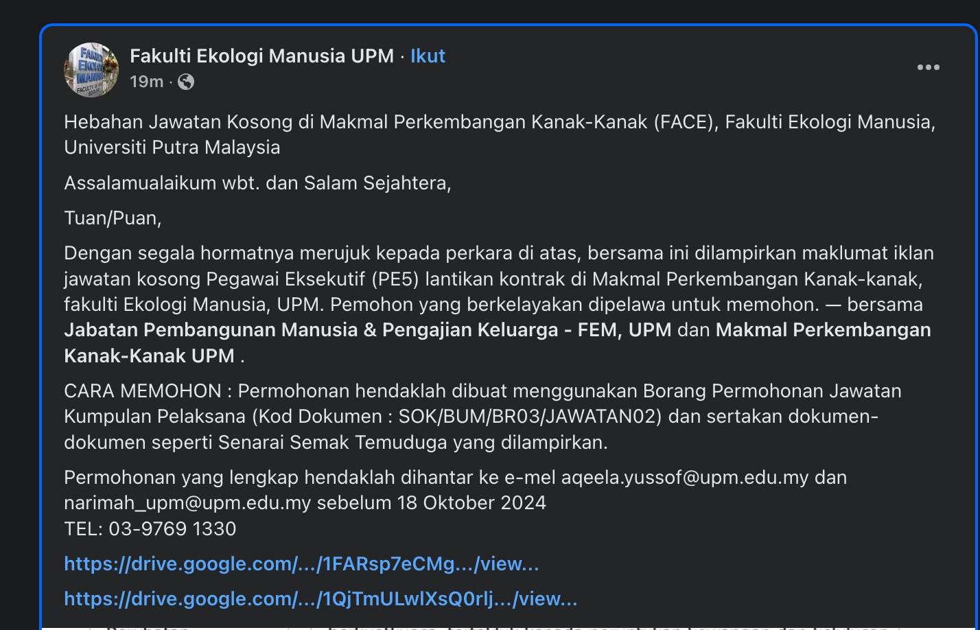 Iklan Kini Jawatan Kosong Terkini Universiti Putra Malaysia (UPM) Klik Jawatan Disini Like serta Ikut Facebook Kami, follow Chanel WhatsApp Jawatan Kosong & Telegram Portal SPA9 untuk capaian pantas kekosongan jawatan daripada kami sekarang.