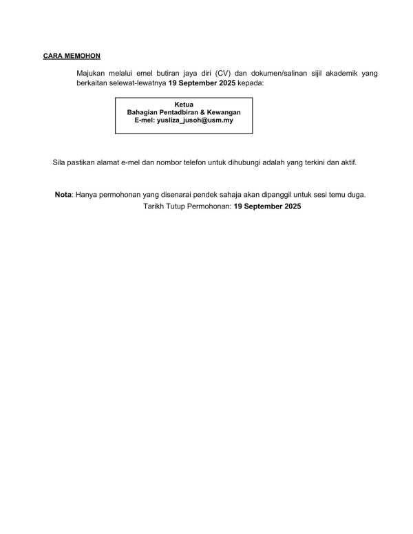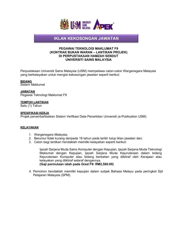 Iklan Kini Jawatan Kosong Terkini Universiti Sains Malaysia (USM) Like serta Ikut Facebook Kami, follow Chanel WhatsApp Jawatan Kosong & Telegram Portal SPA9 untuk capaian pantas kekosongan jawatan daripada kami sekarang.