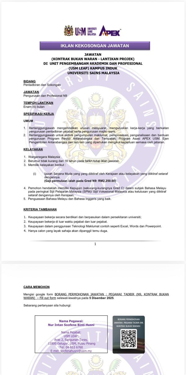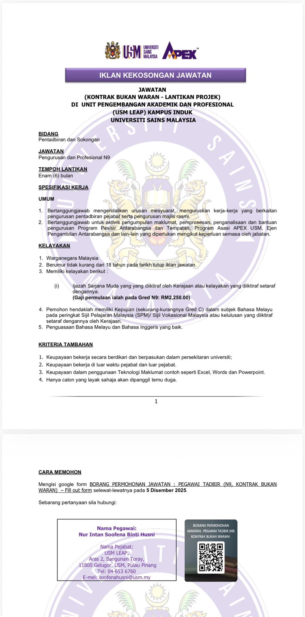 Iklan Kini Jawatan Kosong Terkini Universiti Sains Malaysia (USM) Like serta Ikut Facebook Kami, follow Chanel WhatsApp Jawatan Kosong & Telegram Portal SPA9 untuk capaian pantas kekosongan jawatan daripada kami sekarang.