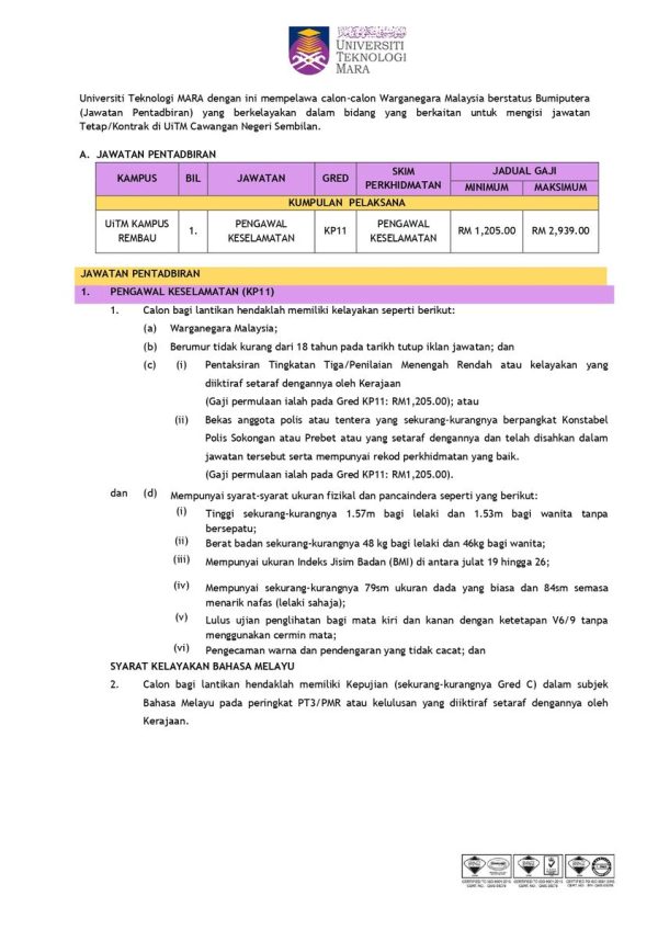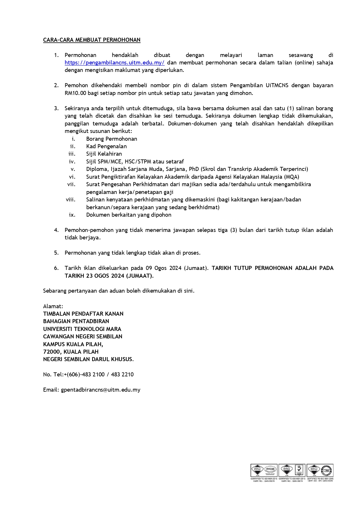 Iklan Kini Jawatan Kosong Terkini Universiti Teknologi MARA (UiTM) Negeri Sembilan Klik Jawatan Disini Like serta Ikut Facebook Kami, follow Chanel WhatsApp Jawatan Kosong & Telegram Portal SPA9 untuk capaian pantas kekosongan jawatan daripada kami sekarang.