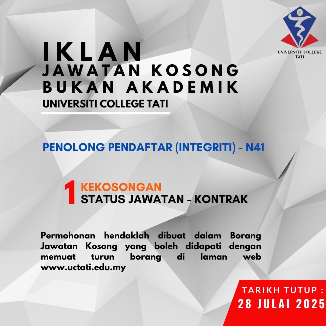 Iklan Kini Jawatan Kosong Terkini University College TATI Like serta Ikut Facebook Kami, follow Chanel WhatsApp Jawatan Kosong & Telegram Portal SPA9 untuk capaian pantas kekosongan jawatan daripada kami sekarang. Klik Jawatan Disini