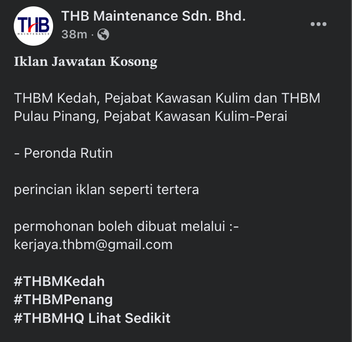 Iklan Kini Jawatan Kosong THB Maintenance Sdn. Bhd. Klik Jawatan Disini Like serta Ikut Facebook Kami, follow Chanel WhatsApp Jawatan Kosong & Telegram Portal SPA9 untuk capaian pantas kekosongan jawatan daripada kami sekarang.