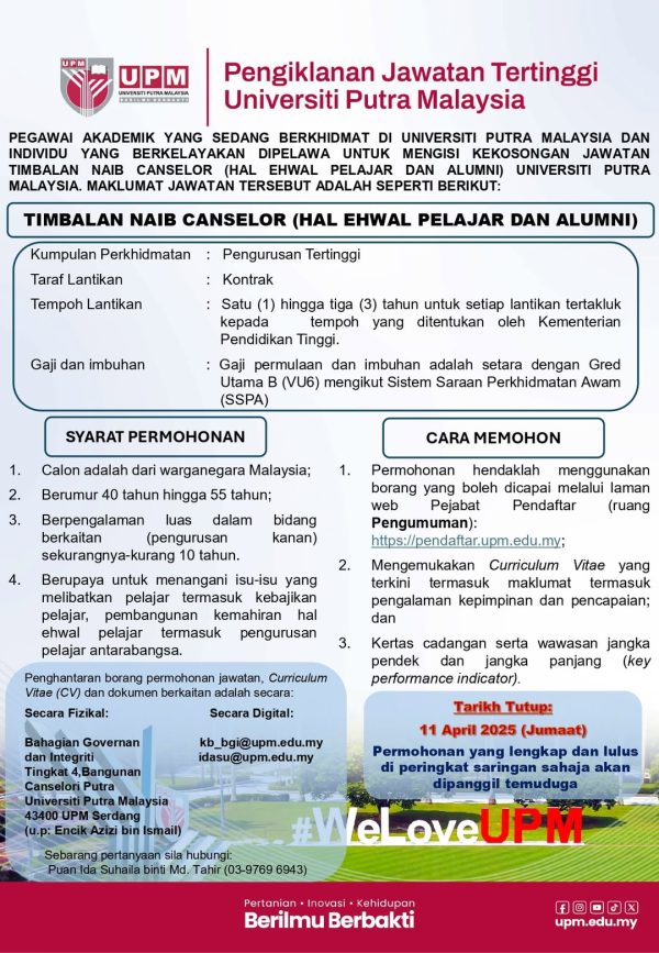 Iklan Kini Jawatan Kosong Timbalan Naib Canselor ~ Universiti Putra Malaysia Like serta Ikut Facebook Kami, follow Chanel WhatsApp Jawatan Kosong & Telegram Portal SPA9 untuk capaian pantas kekosongan jawatan daripada kami sekarang. Klik Jawatan Disini