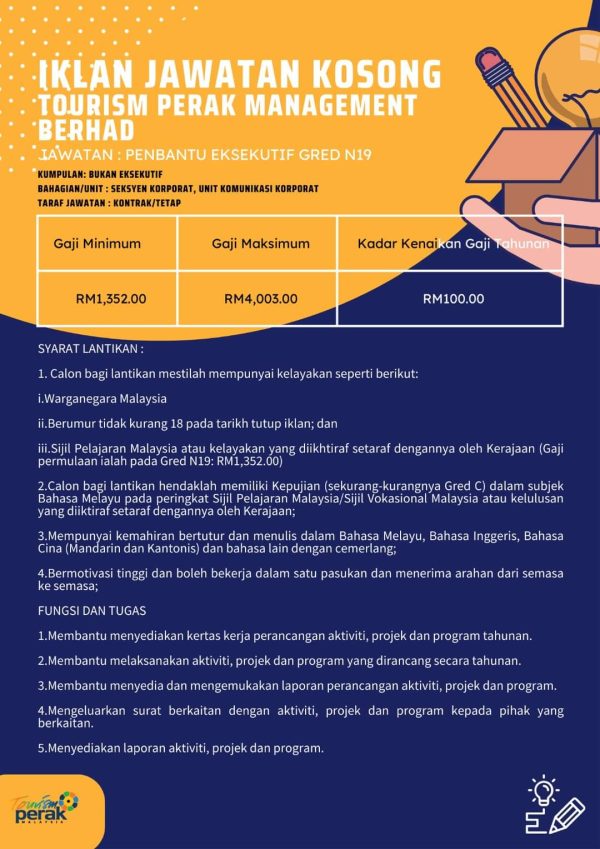 Iklan Kini Jawatan Kosong Tourism Perak Malaysia Like serta Ikut Facebook Kami, follow Chanel WhatsApp Jawatan Kosong & Telegram Portal SPA9 untuk capaian pantas kekosongan jawatan daripada kami sekarang. Klik Jawatan Disini