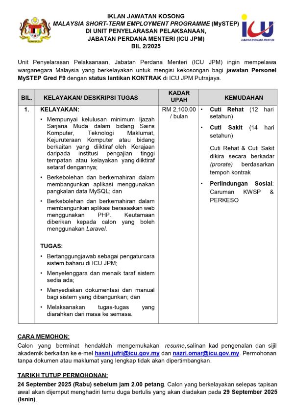 Iklan Kini Jawatan Kosong Unit Penyelarasan Pelaksanaan Like serta Ikut Facebook Kami, follow Chanel WhatsApp Jawatan Kosong & Telegram Portal SPA9 untuk capaian pantas kekosongan jawatan daripada kami sekarang. Klik Jawatan Disini