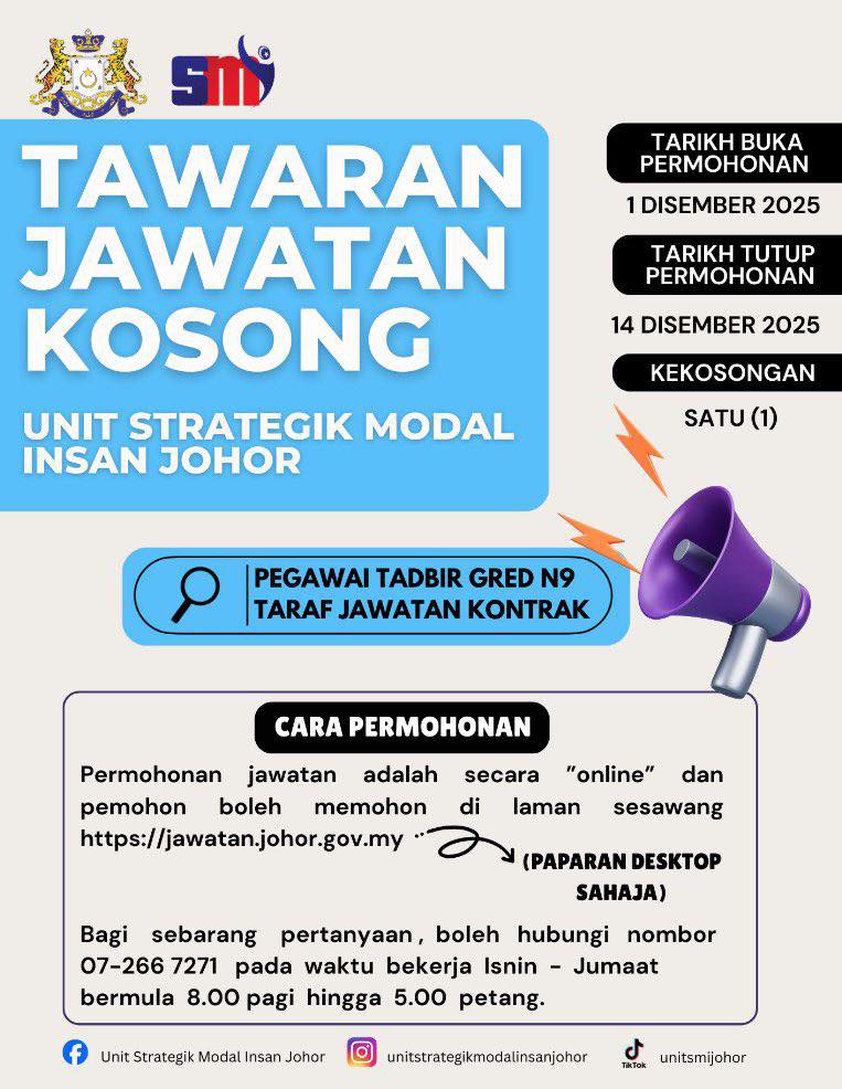Iklan Kini Jawatan Kosong Unit Strategik Modal Insan Johor (SMI) Like serta Ikut Facebook Kami, follow Chanel WhatsApp Jawatan Kosong & Telegram Portal SPA9 untuk capaian pantas kekosongan jawatan daripada kami sekarang. Klik Iklan Jawatan