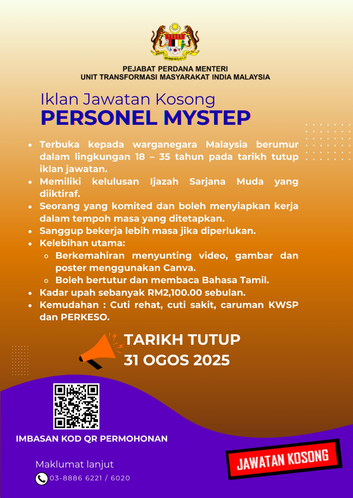 Iklan Kini Jawatan Kosong Unit Transformasi Masyarakat India Malaysia (MITRA) Like serta Ikut Facebook Kami, follow Chanel WhatsApp Jawatan Kosong & Telegram Portal SPA9 untuk capaian pantas kekosongan jawatan daripada kami sekarang. Klik Iklan Disini