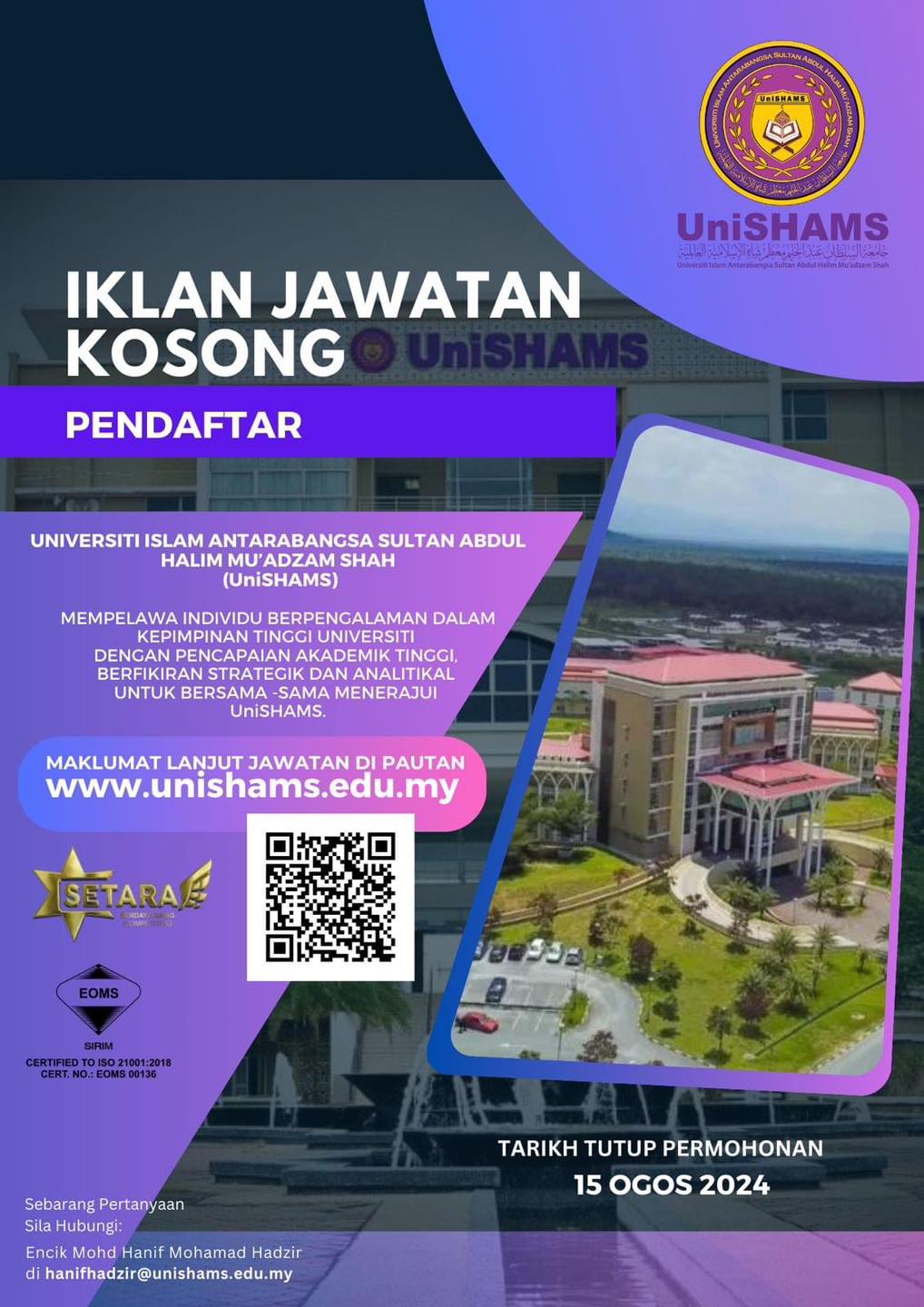 Iklan Kini Jawatan Kosong Universiti Islam Antarabangsa Sultan Abdul Halim Mu’adzam Shah (UniSHAMS)
