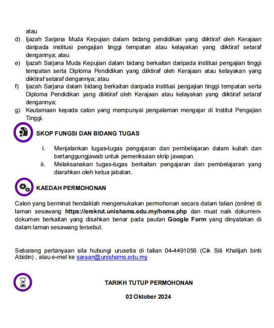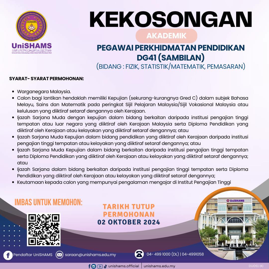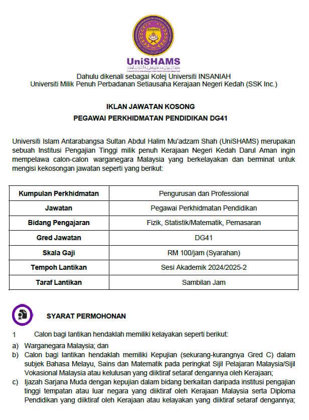 Iklan Kini Jawatan Kosong Universiti Islam Antarabangsa Sultan Abdul Halim Mu’adzam Shah (UniSHAMS)
