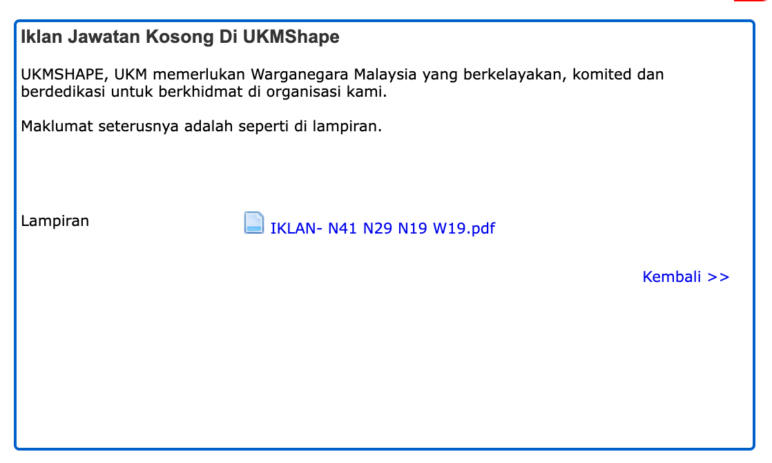 Iklan Kini Jawatan Kosong Universiti Kebangsaan Malaysia UKMSHAPE Like serta Ikut Facebook Kami, follow Chanel WhatsApp Jawatan Kosong & Telegram Portal SPA9 untuk capaian pantas kekosongan jawatan daripada kami sekarang. Klik Jawatan Disini