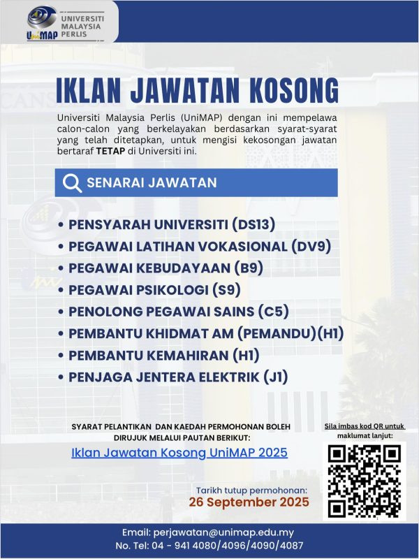 Iklan Kini Jawatan Kosong Universiti Malaysia Perlis (UniMAP) Like serta Ikut Facebook Kami, follow Chanel WhatsApp Jawatan Kosong & Telegram Portal SPA9 untuk capaian pantas kekosongan jawatan daripada kami sekarang.