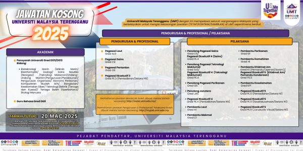 Iklan Kini Jawatan Kosong Universiti Malaysia Terengganu (UMT) Like serta Ikut Facebook Kami, follow Chanel WhatsApp Jawatan Kosong & Telegram Portal SPA9 untuk capaian pantas kekosongan jawatan daripada kami sekarang. Klik Jawatan Disini